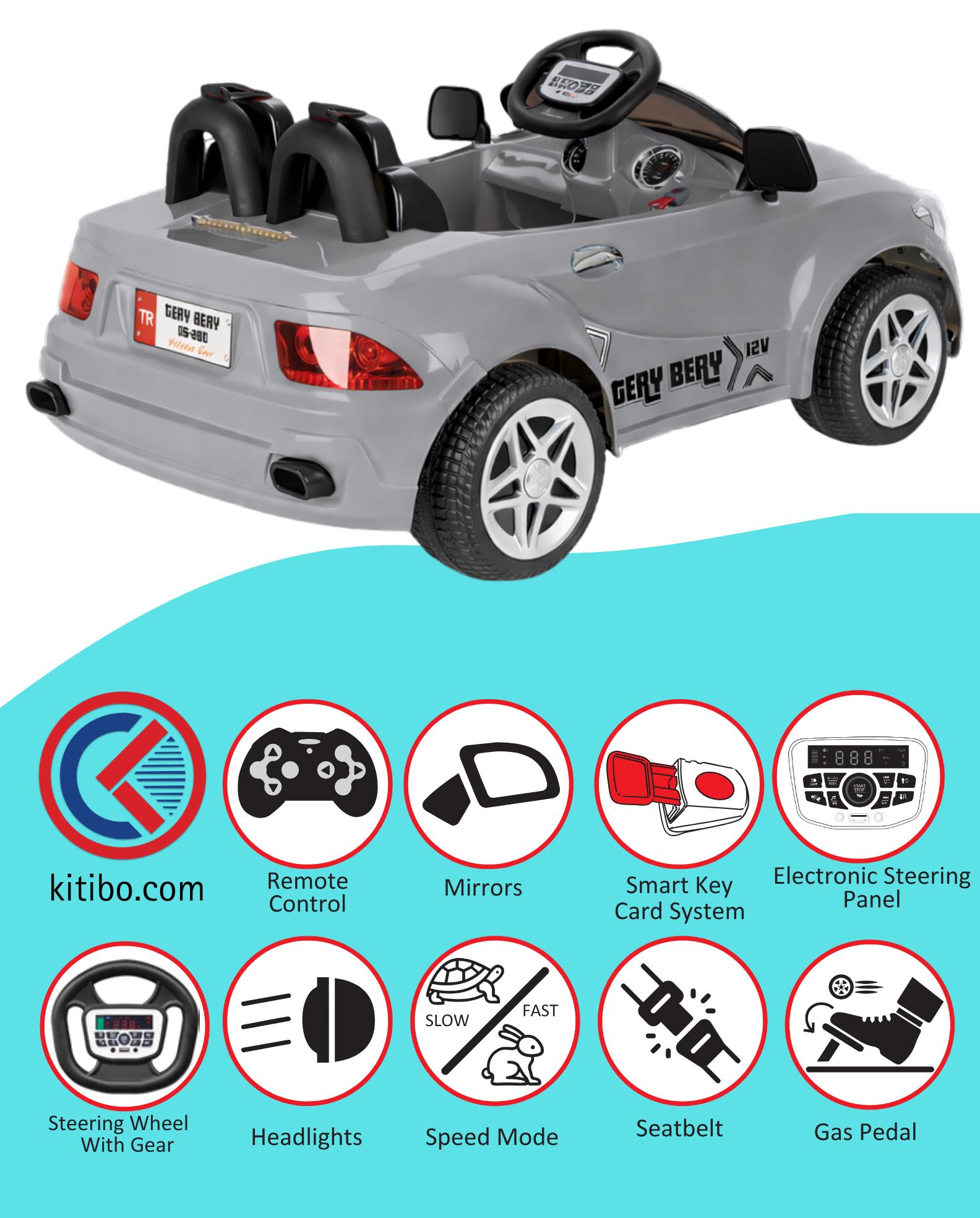 Pilsan Tery Bery Gri 12V Akülü Araba, güçlü motor yapısı, gelişmiş multimedya özellikleri ve ebeveyn kontrollü sürüş sistemi ile çocuklara güvenli ve eğlenceli bir deneyim sunar. Şık gri tasarımı ve gerçekçi jeep görünümü ile dikkat çeken bu model, 12V akü gücü sayesinde dengeli performans sağlar. Uzaktan kumanda desteği ile ebeveyn kontrolü mümkün olurken, bluetooth ve USB özellikleri sayesinde çocuklar müzik eşliğinde keyifli sürüş yapabilir. Yavaş kalkış (soft start) özelliği, emniyet kemeri ve otomatik fren sistemi ile güvenlik ön planda tutulmuştur.